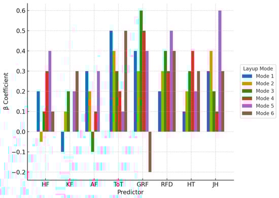 Regression analysis of lower limb joint range of motion and explosive strength on advanced layup success rate. Standardized β coefficients of predictor variables across six advanced layup modes. The X-axis displays eight biomechanical predictors: HF (hip flexion), KF (knee flexion), AF (ankle flexion), ToT (take-off time), GRF (ground reaction force), RFD (rate of force development), HT (hang time), and JH (jump height). The Y-axis indicates the standardized regression coefficients (β), reflecting the strength and direction of each predictor’s influence on layup success rate in each mode.