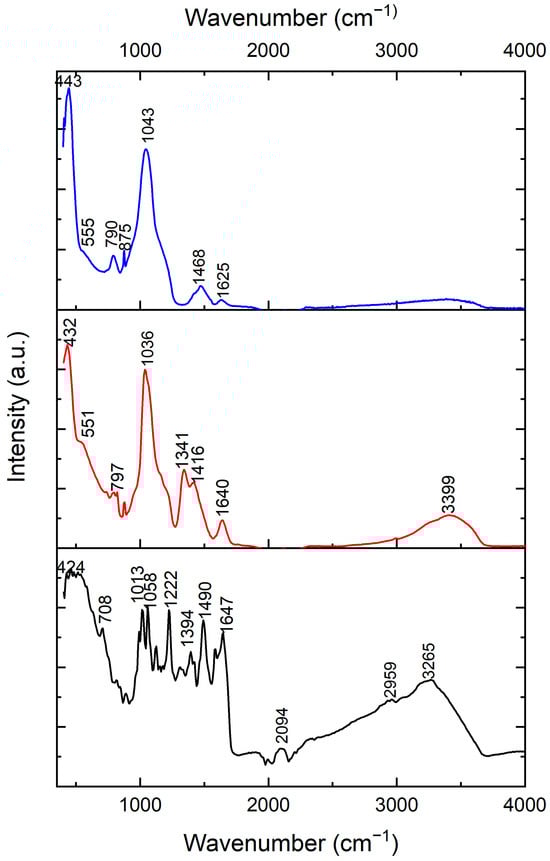 Figure 2 shows the FTIR of the as-synthesized BG-V (red), vancomycin (black), and BG (blue). The vancomycin spectrum shows peaks at 424, 708, 1013, 1058, 1222, 1394, 1490, 1647, 2094, 2959, and 3265 cm−1 which signify the functional groups of vancomycin, including the amide and hydroxyl stretch around 3265 cm−1, the C=O stretching vibration from the amide bonds around 1647 cm−1, and the C-N stretching and bending vibration peaks in the 1200–1500 cm−1 range [24]. The peaks observed at 2094 and 2959 cm−1 represent the R-NH-R and -CH2-CH3 functional groups, respectively. The BG spectra peaks include 443, 790, 875, 1043, and 1468 cm−1, which signify the characteristics of the silica, phosphate, and carbonate peaks. The peaks observed at 790 and 1043 cm−1 represent the Si-O-Si stretching and bending vibrations that are characteristic of the silicate glass, while the peak observed at 875 represents the P-O bending vibration, and the peak at 1468 represents the carbonate group (CO3−2) [25]. The BG-V spectra show peaks at 432, 797, 1036, 1341, 1416, 1640, and 3399 cm−1, which signify the characteristics of the silica, phosphate, and carbonate peaks similar to the BG spectra. Specifically, the peaks at 1036 and 797 cm−1 represent the Si-O-Si stretching and bending vibrations, characteristic of the silicate glass structures. The broad peak at 3399 cm−1 suggests hydroxyl stretching with a shift of the peak for the BG-V, indicating interactions between the hydroxyl and amide groups. The higher intensity of the peaks observed at 1341 and 1416 cm−1 of the BG-V suggests the integration of vancomycin into the BG pores during synthesis. The peak at 1640 cm−1 suggests retained amide C=O stretching, indicating the maintenance of vancomycin’s integrity within the composite. This is consistent with previous studies which demonstrated the successful incorporation of vancomycin into polymeric carriers like PCL microspheres [26] and mesoporous silica nanoparticles (MSN) [27]. The spectral evidence provided here agrees with the findings of these studies, confirming the integration of vancomycin without chemical degradation.