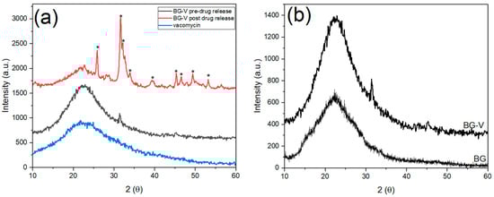 (a) XRD of vancomycin (blue) and BG-V before drug release in PBS (black) and after drug release studies (red); (b) shows BG-V and BG. The peaks marked with * indicate HA development on the surface of BG-V.