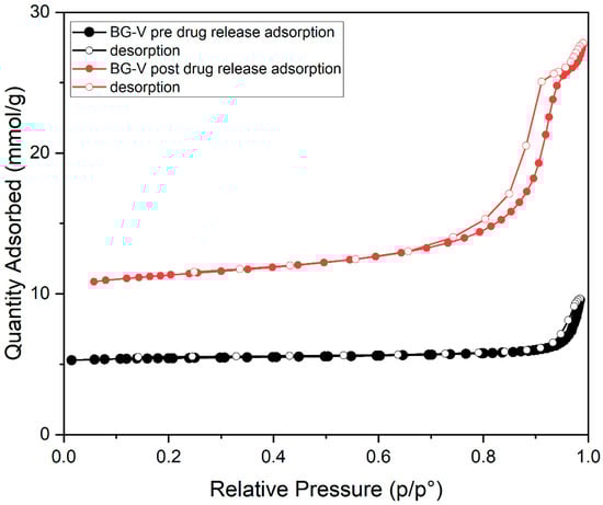 The nitrogen adsorption–desorption graph shown in Figure 4 represents the BG-V before drug release (black). It is observed that the graph shows a type IV isotherm with no hysteresis, indicating that there is a lower surface area as the pores are blocked by the adsorption of vancomycin onto the BG. The second graph in red shows that after the drug is released, the isotherm observed is type IV with hysteresis, indicating a vertically oriented horn-shaped pore [33]. This shows that following drug release, the pores of BG-V open and the surface area increases; this aids in the gradual release of the vancomycin from the BG as it allows it to release the physically adsorbed drug followed by the entrapped drug that is being held by hydrogen bonds. The development of hydroxyapatite on the surface of BG also contributes to the increase in the surface area, as the silanol layer (Si-OH) is converted into HA.
