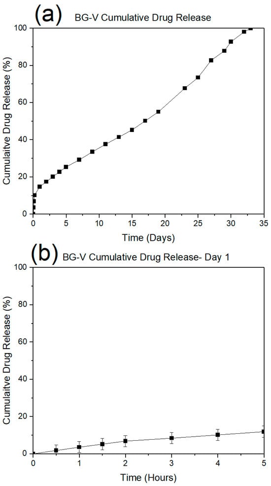The drug release studies were conducted in PBS at physiological pH 7.4 to simulate in vivo conditions. Figure 7a shows the drug release observed on day 1, demonstrating a rapid initial release where approximately 20% of the vancomycin was released within the first few hours. This is followed by a plateau phase, indicating that the initial burst corresponds to the release of drug molecules adsorbed on the surface, which occurs within 4 to 5 h.