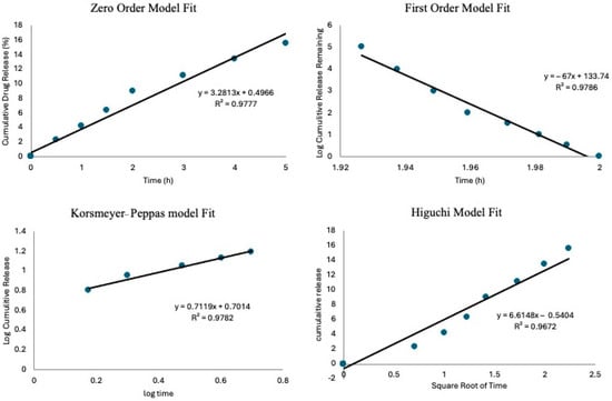 The drug release kinetics models show the goodness of fit for the zero–order model, first–order mode, Korsmeyer–Peppas mode, and Higuchi model.