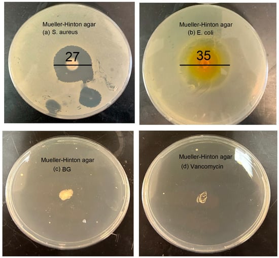 Antimicrobial susceptibility testing was conducted using the agar well diffusion method as shown in Figure 9. Sterilized BG-V samples were placed in wells within the agar to evaluate their antibacterial activity. The experiment was performed in triplicate to ensure the accuracy and reproducibility of the results. The plates were incubated at 37 °C for 24 h, after which the zones of inhibition (ZOI) were measured [43]. Figure 9a shows that the disc diffusion test against S. aureus on Mueller–Hinton agar revealed a ZOI of 27 ± 0.2 mm, indicating a strong antibacterial effect. Similarly, Figure 9b shows that the test against E. coli showed a ZOI of 35 ± 0.4 mm, demonstrating a strong antibacterial effect against this Gram-negative bacterium as well. Figure 9c,d show the negative bioactive glass and positive vancomycin controls, respectively. The negative control shows no measurable ZOI, confirming that the observed effects are not due to the bioactive glass itself, while the positive control inhibited bacterial growth completely, confirming the effectiveness of vancomycin against bacteria. The well-defined circular shape of the ZOI reflects the consistent diffusion of vancomycin from the BG-V, suggesting homogeneity in drug loading and release from the BG-V matrix.