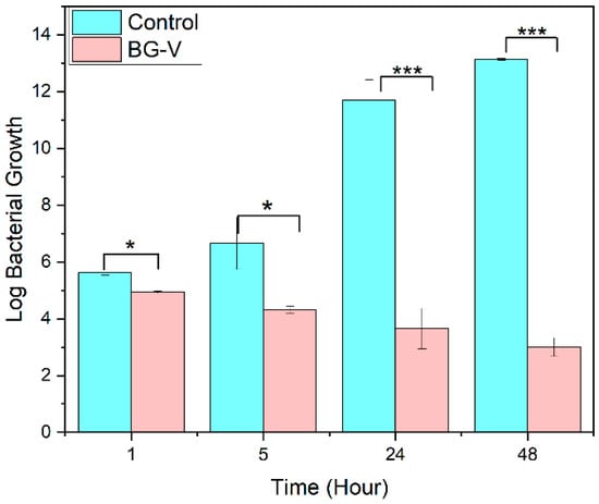 Bacterial killing assay comparing the control group to BG-V at 1 h, 5 h, 24 h, and 48 h. The figure shows the log bacterial growth of the control group compared to BG-V. The statistical difference is indicated by the *, where * shows that the p < 0.05, while *** shows that p < 0.001. The data are presented as mean ± standard deviation and all the experiments were performed in triplicates.