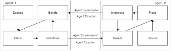 Numerous tools have been developed for implementing MASs, with the internal architecture of agents in the predominant majority of them being based on the BDI concept [15,16,17,18]. In general, a BDI (Belief–Desire–Intention) agent is defined in terms of beliefs, desires, and intentions. Here, beliefs represent the agent’s knowledge of the world, desires correspond to its objectives, and intentions denote the actions the agent deems necessary to execute. When implementing BDI, the agent’s knowledge system is augmented with behavioral model components that refine its decision-making. Within the agent’s architecture, concepts such as rational behavior, reasoning, goals, plans, and others may be formalized.