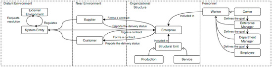 Existing solutions for modeling organizational systems using MASs [8,9,10,11,12] offer a limited set of agent roles reflecting the types of production departments, but not the types of their employees and environmental agents. Overcoming this limitation by introducing an invariant ontology for managing complex production systems simplifies the development of models for specific enterprises.