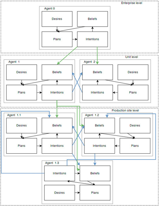 The agent’s belief system can be predefined and updated during simulation. Desires may either be prescribed or emerge through interactions with the environment. Intentions are determined during modeling based on desires and beliefs [15,16,17,18]. Designing a multi-agent system (MAS) for complex technical and socio-economic systems does not require the development of agent-specific belief systems, as established approaches can be employed. Similarly, there are no constraints on how desires are formed or how agents select actions to execute.