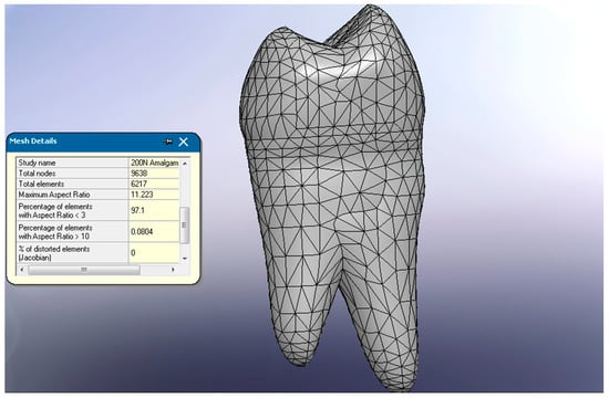 The materials used in this analysis, along with their characteristic parameters, were stored in a material library from which they could be accessed. In this specific study, three types of materials were defined: amalgam, dental enamel, and a composite.