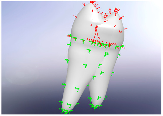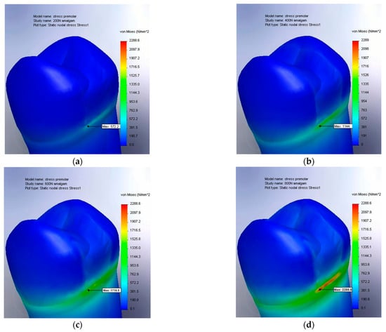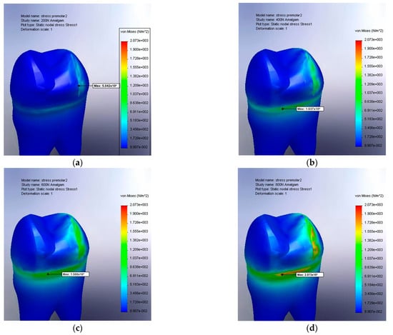 15]. The inclusion of an intermediate value of 400 N allowed for the investigation of the structural response to an increased masticatory force situated between the physiological norm and the maximum threshold reached under parafunctional conditions.