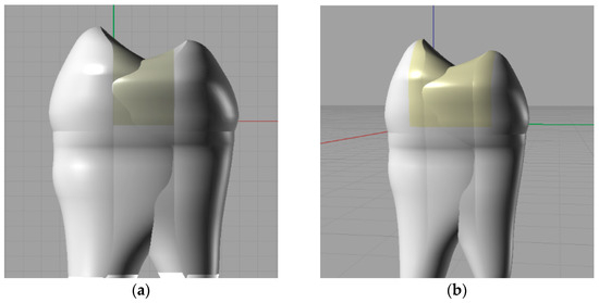 Figure 7a,b, which depict a premolar restored with the composite material. Increased stress (represented by progressively lighter shades of blue) can be observed both at the interface with the filling material and within its deeper structure. This indicates a stress distribution that affects not only the contact zone between the material and the tooth but also the internal structure of the restorative material itself.
