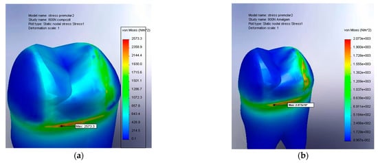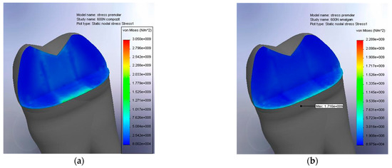 Figure 8a indicates that the resulting stresses are significantly higher under identical loading conditions (a maximum of 3047 MPa for the composite compared with 2288 MPa for the amalgam).