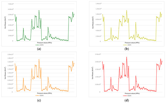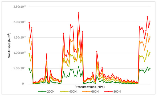 Figure 9). It was observed that the stress values ranging between 200 and 400 N generated a von Mises distribution with values below 1500 MPa. Under these conditions, the physical alterations were relatively minimal, suggesting an elastic behavior of both the restorative materials and the dental tissue without significant structural changes (such as cracks or shrinkage) and with reversible deformations.