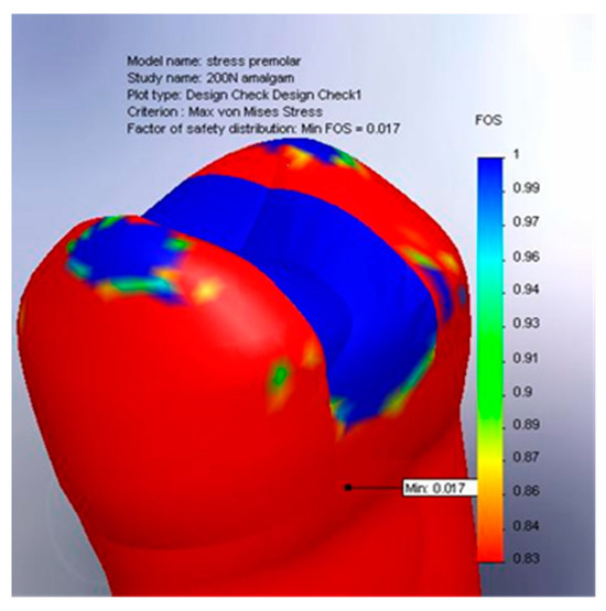 Figure 12, which presents the spatial distribution of the safety factor (SF) in the amalgam restoration, the values remain predominantly in the favorable range, with large blue zones indicating the regions where the SF approaches 1. This reflects a low risk of mechanical failure and confirms the material’s ability to efficiently absorb applied forces without undergoing critical deformation. Nonetheless, the small red and orange areas—particularly at the margins—highlight localized stress concentrations where the safety factor may decrease to as low as 0.017.