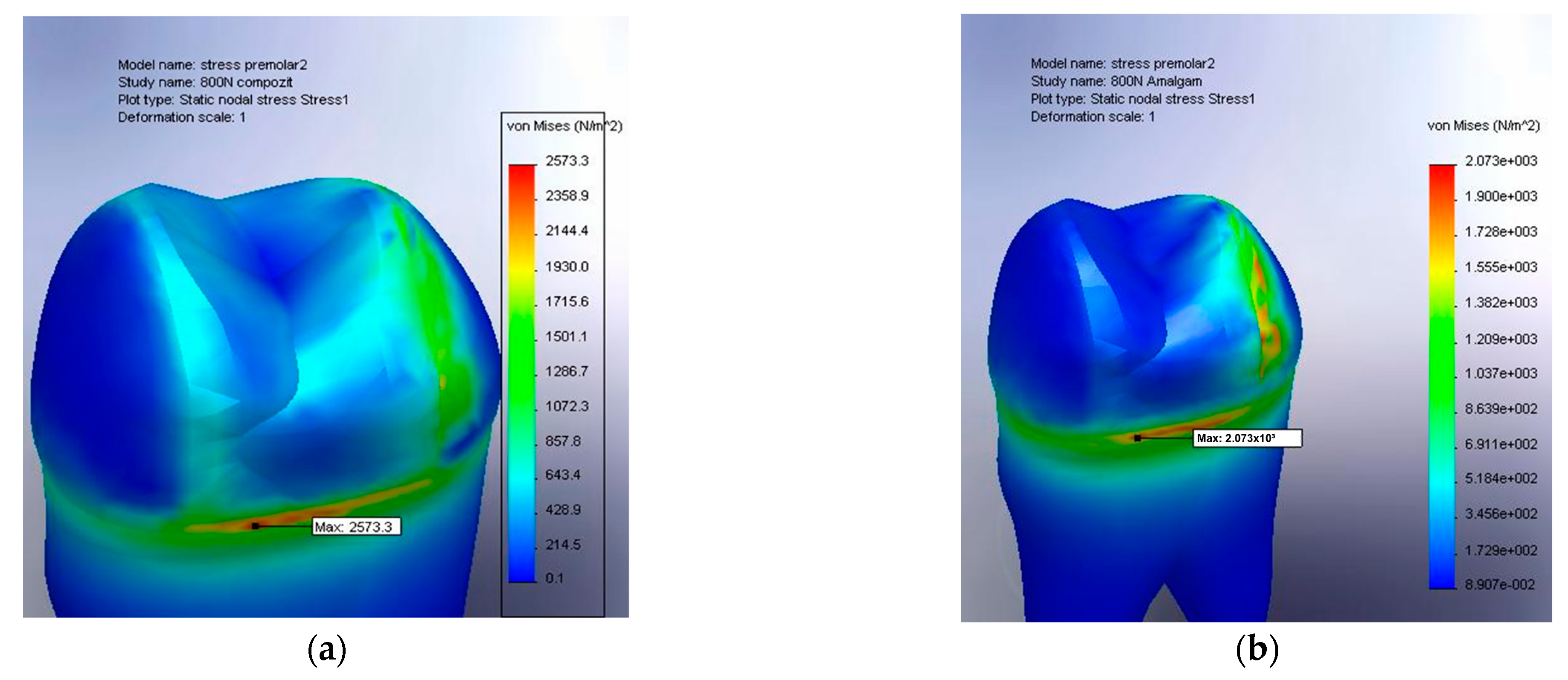 In contrast, the application of an 800 N load resulted in extremely high stress values within the restorative material in both the composite and amalgam restorations, leading to the formation of cracks and accelerated degradation of the premolar–restoration complex. Although the maximum von Mises stress values were higher in the composite (reaching up to 3047 MPa, compared with 2288 MPa for the amalgam), the internal structure of the composite—due to its network of intermolecular bonds—enabled a deeper distribution of stress, reducing its concentration in critical areas. This differentiated behavior reflects the distinct ways in which the two materials absorb and manage occlusal loads, depending on their nature and the intensity of the forces involved.
