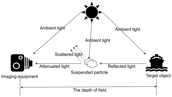 The light reflected from the surface of the target object is absorbed and scattered by the suspended particles in the atmospheric medium during propagation, resulting in light attenuation. Ambient light scatters in the atmospheric medium, which affects the brightness distribution of the imaging. Through the superposition effect of these two physical processes, the final imaging exhibits problems such as contrast drop and color distortion.