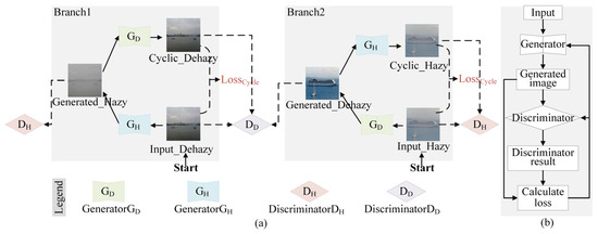 The proposed FA-CycleGAN consists of two generators and two discriminators, and the two branches of the network are used to generate hazy and haze-free images as shown as (a). The workflow of generator GD and generator GH is shown in (b).