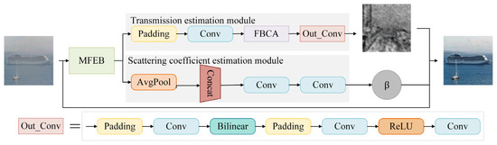 Image dehazing is performed on the input hazy image by the GD. The model structure is shown in Figure 3. The pseudocode is shown in Algorithm 2. The depth information of the image is estimated through feature extraction and residual fusion by the transmittance estimation module. The scattering coefficient of the image is estimated through feature extraction and average pooling operations by the scattering coefficient estimation module. GD is first used to extract features from the input image, H. The extracted features at different levels are processed to obtain the image’s transmittance, , and scattering coefficient, , as follows: