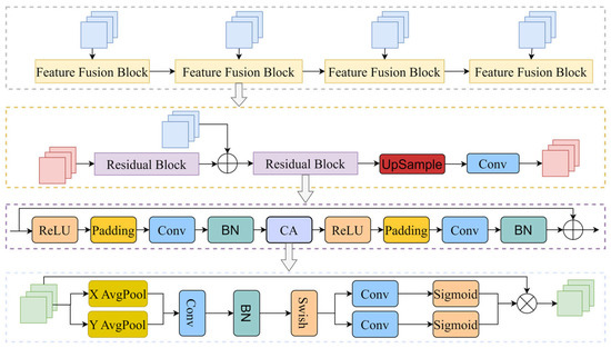 The feature fusion attention module (FBCA) performs multi-scale feature fusion on extracted features of different levels. Its structure is shown in Figure 5. The idea of residual connection is adopted in FBCA, where different levels of features are separately fed into different feature fusion blocks for fusion. The output of the previous layer’s feature fusion block is processed by a residual unit and added to the input features of the current layer. The result of this addition is then processed by the residual unit to obtain the output of the current layer. This approach allows for improved retention of low-level features while promoting the learning of high-level features, thus improving the dehazing effect. To enhance the model’s attention to input data, the CA attention module is introduced to improve the model’s performance in handling complex tasks. In this module, the model can focus on complex areas to recover details more efficiently. Most current attention mechanisms (e.g., SE attention mechanism) significantly enhance model performance. Unlike traditional channel attention, which aggregates spatial information globally and may overlook location-specific features, attention is decomposed by CA into two complementary 1D encodings along the horizontal and vertical directions. This approach captures long-range dependencies while preserving precise positional information. By embedding location awareness into channel attention, CA allows the network to adaptively emphasize features that are not only important across channels but also relevant to specific spatial coordinates. This enables the generator to identify and enhance important regions, such as object boundaries, edges, and textured areas, which are often degraded or obscured in hazy images. This results in better structural preservation, reduced artifacts, and improved clarity in localized areas in practice. Thus, the integration of CA within the FBCA module helps the network focus on both channel importance and spatial position, leading to a more refined feature representation that contributes to more effective and visually coherent dehazing outcomes.