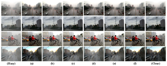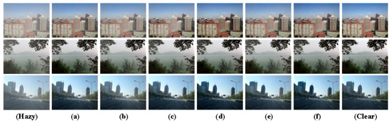 From the visual effects shown in Figure 11, it can be observed that the original CycleGAN network’s dehazing is not thorough, with “pseudo-shadows” present in some areas and the sky area exhibiting localized exposure. After improving the generators based on the atmospheric scattering model and loss function, the model can make full use of physical prior information; there are no longer any “artifacts”, and the local exposure of the sky area is improved. This demonstrates that physical prior modeling effectively provides more reasonable guidance for dehazing. After introducing the FBCA module, the model can fully integrate the features of each level and assign different weights. The model exhibited significantly enhanced restoration capabilities in detailed regions (such as object edges and texture-rich areas). Therefore, the model can effectively restore image color, dehazes more thoroughly, and significantly improves the visual effect. On the whole, the ablation experimental results fully verify the effectiveness of each improved module, achieving the best performance across multiple evaluation indicators. The improved model enhances the understanding and generation ability of image information, which helps further improve the dehazing performance of the model, so that the processed image can retain more details and generate images that are more in line with human eye perception.