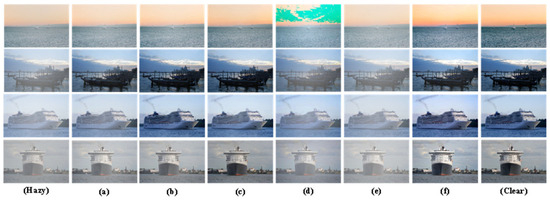 In the land scene, the OTS is used for training models and comparison methods. SOTS-outdoor was synthesized in the same way as OTS and was selected as one of the test sets. SOTS-indoor and I-HAZE differ in terms of scenes and haze types, and the results from these two test sets can reflect the adaptability of the model to different scenes. The comparison results are shown in Table 1. The visualization results are shown in Figure 8.