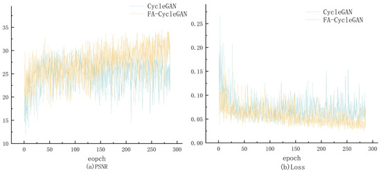 As shown in Table 3, by improving the generator network structure, the PSNR and SSIM increase by 16.10% and 25.24%, respectively, indicating that after combining the atmospheric scattering model, the model can make full use of the physical characteristics of fog to better learn image features. The generator of the traditional CycleGAN is based on a residual network, which is more complex to calculate, while the improved generator greatly reduces the amount of computation, thus achieving better results in terms of FLOPs. After the introduction of the improved loss function, the performance of the model is further improved, indicating that the optimization of the loss function can better guide model training and optimize parameters. Compared with the original network, the PSNR increases by 32.10%, the SSIM increases by 31.07%, the information entropy increases by 4.79%, and the NIQE index is reduced by 20.1%, indicating that the quality of the dehazed image has been significantly improved. With the introduction of the FBCA module, the best test results were achieved, with a 32.10% increase in PSNR and a 31.07% increase in SSIM compared to the original network. The dehazed image processed by the model is clearer and more in line with human visual perception. Due to the introduction of the FBCA module, the proposed method results in a moderate increase in the indicators of Params and FLOPs. However, as demonstrated by the experimental results, this increase leads to significant improvements in performance, representing a reasonable trade-off between performance and computational cost. As shown in Figure 10a, it can be observed that with the increase in training epochs, the PSNR of both methods shows an overall upward trend. However, FA-CycleGAN consistently achieves higher PSNR values across different stages and exhibits smaller fluctuations, indicating better stability and convergence. These results demonstrate that FA-CycleGAN is capable of generating higher-quality dehazed images, thereby validating the effectiveness of the proposed method in preserving image details and improving dehazing performance. As shown in Figure 10b, both models exhibit a decreasing trend in loss as training progresses, indicating successful convergence. Notably, FA-CycleGAN maintains consistently lower loss values with smaller fluctuations throughout the training process and converges more rapidly compared to CycleGAN. This result further supports the effectiveness of FA-CycleGAN in achieving better stability and optimization during model training.