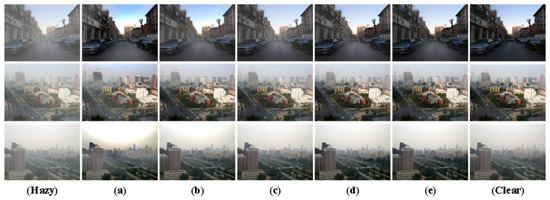 (a–e) Visualization results of five different haze densities before and after dehazing the MDD dataset.