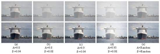 In order to verify the robustness of the model against different haze densities, the following experiments are designed. In the experiment, the conditions of light, moderate, and heavy haze were simulated by setting different atmospheric light values (A) and scattering coefficients (β). Specifically, A is set to 0.8, 0.9, 0.95, and Random, where “Random” represents a random selection in the range of [0.8–1.0]. The β is set to 0.04, 0.08, and Random, where ”Random” represents a random selection in the range of [0.04–0.08].