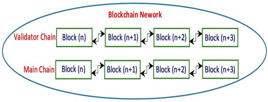 The Nazfast consensus is designed for proof-of-stake-based blockchain. Our presented consensus uses a dual-chain blockchain network, such as in Figure 1, which shows two parallel chains working together. A main chain saves the records/transactions of the network by using the Nazfast consensus. A validator chain saves the node’s details when it becomes a validator and leaves its responsibility as a validator in the network to improve the overall security of the network.