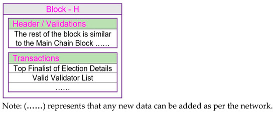 We save the election result in our main chain to deal with any forgery in the future. After the election mechanism and finishing other responsibilities, the election starter will create a block with all the details of the election result and digitally sign it. The block structure to save the election result is similar to the main chain of other blocks, except for transactions. Figure 3 shows the block structure. In the transactions, it would save all the election results of the current election. First figure in Section 4 describes the complete block structure for the main chain blocks. The block will be dealt with by any block creation cycle that is present at that time. The block will go through the consensus process and become part of the main chain like other blocks of the network.