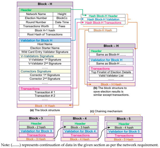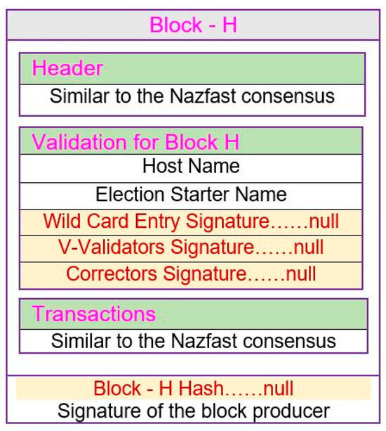 To create a block in the network, the block producers first collect all valid transactions from the system according to the types discussed above. The zero-knowledge proof [37] will be used to validate the transactions. After collecting transactions, the block producer will create the block by using the Nazfast block structure. The block structure for Nazfast consensus is based on a general PoS-based network block structure. Figure 4 shows the block structure for the Nazfast consensus in the network. Part (a) in the figure shows the block structure for the Nazfast consensus. The block is divided into three parts: Header, Validation, and Transactions.
