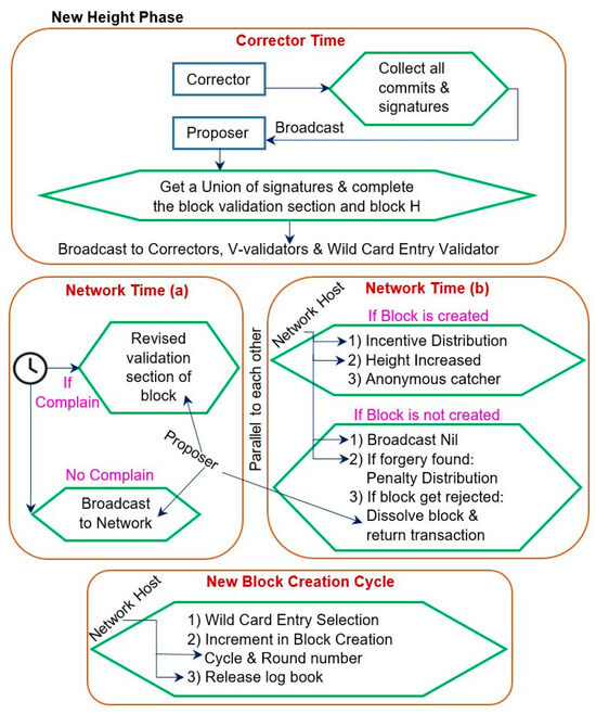 In each block creation cycle, we have a wildcard entry validator. It is an anonymous validator whose identity is unrevealed by all other selected validators. The validator is linked with any of the V-validators. The wildcard entry validator’s responsibility is like a V-validator. There is a pool of active validators with hidden identities. The wildcard entry validator can be any validator among all other active validators from this pool. For round one’s first block creation cycle, the election starter is selected randomly as a wildcard entry validator from the pool. If the election starter is inactive or not present in the system for any reason, then the network host will select the wildcard entry validator. After the first block creation cycle, every wildcard entry validator selects the next wildcard entry validator for the next block creation cycle in the new height phase. For the genesis block creation process, the host will select the wildcard entry validator. After the wildcard entry validator selection, the host will release the actual identity of the wildcard validator to the consensus group and its connections just before the start of the block creation process.