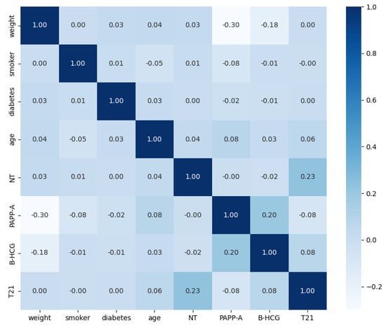 The primary objective of this stage was to gain a deeper understanding of the underlying data to clarify feature importance and select the features with the greatest impact on the training workflow. To achieve this, the distribution of the features was examined, combining clinical knowledge with insights derived from the data. The features “ethnicity”, “diabetes”, “smoker”, and “familiar antecedents” were excluded from the training phase due to the low proportion of samples with diverse ethnicities and the small percentage of pregnant women with diabetes or a family history of T21 or T18–T13. Specifically, this exclusion was based on the principle that features with very few representative samples can introduce bias and instability into machine learning models, reducing their ability to generalize well. Figure 1 illustrates the Pearson correlation between features, revealing a correlation between PAPP-A, NT, B-HCG, age, and the trisomy 21 diagnosis. Pearson correlation, a standard measure of linear association, was used here to quantify the extent to which these variables change together. The correlation coefficient ranges from −1 to +1, where values close to −1 or +1 indicate a strong linear relationship and values near 0 indicate a weak linear relationship. It is important to note that while some correlations are observed, many of them are quite small, suggesting limited linear dependencies between those variables. Low PAPP-A values correlate with positive T21 cases (meaning PAPP-A tends to decrease as the likelihood of T21 increases), while high B-HCG and NT values also correlate with positive cases (meaning B-HCG and NT tend to increase with the likelihood of T21). These relationships are further shown in Figure 2. Following this step, only four features were selected for the training phase—age, PAPP-A, B-HCG, and NT—in addition to the outcome variable itself.