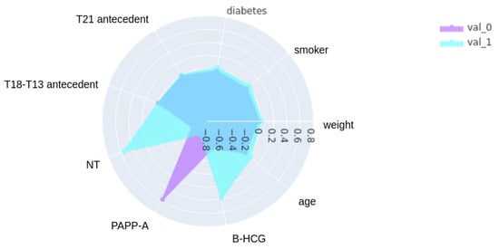 In recent years, machine learning techniques have been increasingly applied to this use case to improve prediction accuracy and prenatal screening [,]. Machine learning algorithms can analyze complex datasets and identify patterns that may not be apparent using traditional statistical methods. These algorithms can integrate various data sources, including maternal serum markers, ultrasound measurements, and even cell-free DNA information, to provide more accurate risk assessments. Several studies have demonstrated the potential of machine learning in prenatal screening. For instance, researchers have explored the use of support vector machines (SVMs), random forests, and neural networks to predict the risk of Down syndrome and other chromosomal abnormalities. For example, Koivu et al. achieved an area under the ROC curve of 0.96 and a detection rate of 78%, with a 1% false positive rate in the first trimester using a cohort of 1850 individuals []. He et al. published a study with 58,972 screening data that achieved a 0.89 ROC-AUC, although the prediction in that work was for the second trimester []. The work of Jamshidnezhad et al. is also relevant; they reported a specificity of 99.72%, a sensitivity of 90.91%, and a mean square error of 0.61%, but these figures are based on the average of 10 experiments with a limited population of only 381 pregnant women []. Furthermore, machine learning can be used to personalize risk assessment by incorporating individual maternal characteristics, potentially leading to more tailored and accurate screening results. While the application of machine learning in prenatal screening is still an evolving field, the initial results are promising and suggest that these techniques have the potential to significantly improve the accuracy and safety of Down syndrome screening.