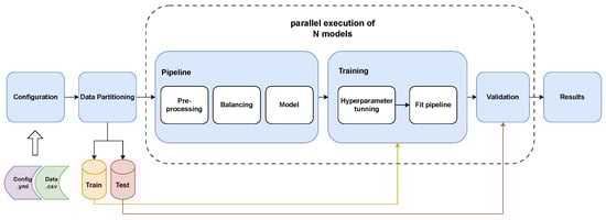 Prior to the training stage, a pipeline of transformers and a final estimator is constructed. This pipeline is used in both the training and validation steps, ensuring that all transformations are consistently applied to the training, validation, and prediction data. As shown in Figure 3, the pipeline comprises three steps: pre-processing, balancing, and modeling. The first two transformation steps are applied sequentially, followed by the execution of a final estimator, enabling cross-validation of the assembled steps.