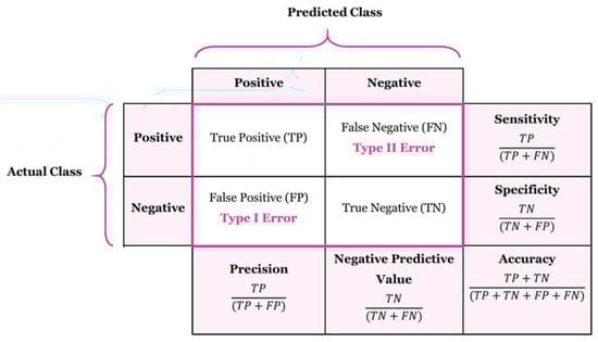 The performance measures used for validation were calculated using a confusion matrix, which represents the number of positive and negative predictions made by a classifier, as shown in Figure 4. In the matrix, TP represents the number of true positives, TN the number of true negatives, FP the number of false positives, and FN the number of false negatives. The following measures were used to evaluate the models’ performance: