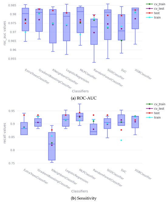 Cross-validation and train/test scores. In the boxplots, the green and purple dots represent the scores obtained during k-fold CV; the blue and red dots represent the scores obtained during the train/test stage. (a) shows the ROC-AUC score, and (b) shows the sensitivity score.