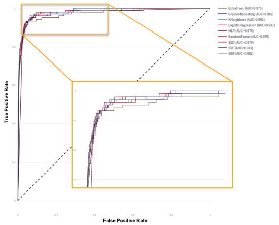 The hyperparameters selected for each model are presented below; the nomenclature is consistent with that used in the scikit-learn library. The logistic regression (LR) method used elastic net regularization as a penalty, with an l1 ratio of 0.7 and a C value of 5000. The Multi-Layer Perceptron (MLP) employed a 3-hidden-layer network with 4, 2, and 1 neurons in each layer; the learning rate method was ‘adaptive’; the solver was ‘adam’; the activation function was ‘ReLu’; the alpha value was 0.586; batch size was automatic; and early stopping was enabled. The Stochastic Gradient Descent (SGD) method used a constant learning rate with an alpha value of 0.04, an eta0 of 0.006, and the l1 norm. The gradient boosting (GB) method utilized 300 estimators with a maximum depth of 1, a maximum of 0.34 features per node, a minimum of 0.21 samples per leaf, and the friedman_mse method with a learning rate of 0.1. The random forest (RF) method employed the gini criterion with 325 estimators, a maximum depth of 4, and a minimum of 0.01 samples per leaf. The Extra Trees (ET) method also used the gini criterion with 325 estimators, a maximum depth of 6, and a minimum of 0.02 samples per leaf. The Support Vector Classifier (SVC) method used the sigmoid kernel, with gamma values of 0.005 and a C value of 10. Finally, the XGBoost method used 150 estimators with a maximum depth of 1, a subsample ratio of 0.3, an alpha value of 0.145, a lambda value of 0.3, and an eta value of 0.1.
