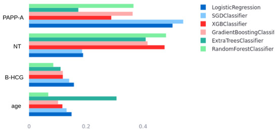 The results indicate that the data used to train the models exhibit well-defined patterns among the different variables and the outcome, enabling highly accurate predictions. The ROC curves for each model are shown in Figure 6; there is minimal difference between most of them, which aligns with the data analysis in Section 2.2.1. Figure 1 and Figure 2 clearly show that high PAPP-A values correlate with negative cases, while high NT and B-HCG values correlate with positive cases. The remaining variables do not appear to have a statistically significant impact on the outcome; however, they do influence the significance of the models. For example, Figure 7 shows the feature importance assigned by each model. Feature importance could not be calculated for every algorithm; therefore, only those that provide this metric are shown. All methods selected only four features: PAPP-A, NT, B-HCG, and age. The other features were discarded because they did not significantly improve the predictions and only introduced noise, reducing model performance. Notably, the linear models (LR and SGD) assign greater importance to PAPP-A and B-HCG compared to the other models, for which NT is the most important variable.