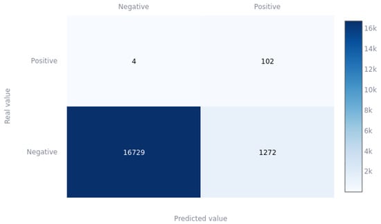 Finally, Figure 8 presents a confusion matrix with the test data partition of the XGBoost model with the threshold selected by the gmeans method (0.41). It is clear how practically all of the positive cases are classified correctly (0.943 sensitivity), even with the large unbalance problem in the initial dataset. This is largely due to the data balancing techniques used during training. In the case of the negatives, it can be seen to have an equally high predictivity (0.939 specificity).