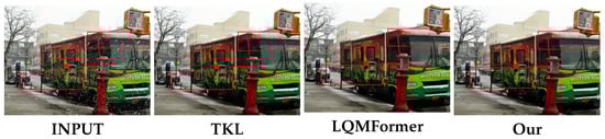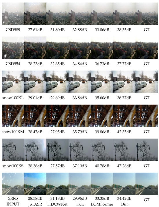 To demonstrate the effectiveness of the proposed algorithm, a quantitative comparison was conducted with other state-of-the-art algorithms on three major benchmark datasets, including single-image snow removal algorithms [,,,,] and severe-weather image restoration algorithms [,,,]. During the comparison, if the compared methods provided reproducible code, we reproduced the methods and obtained the results. If no code was provided, we referred to the results presented in the respective papers or other widely recognized experimental results for comparison. The comparison results are shown in Table 2. Compared with other state-of-the-art methods, the proposed method achieves the best results across three benchmark datasets. In particular, on the SNOW100K and CSD datasets, the PSNR and SSIM metrics exhibit outstanding performance. Compared to the second-best method, LMQFormer, the PSNR of the proposed algorithm improves by 1.12 dB and 2.03 dB on the SNOW100K and CSD datasets, respectively. The SSIM improves by 0.028 and 0.011, respectively. This fully demonstrates the superiority and stability of the proposed algorithm.