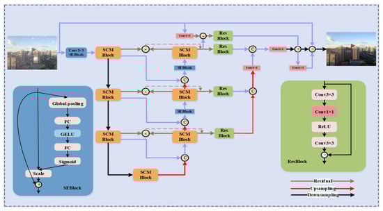 The multi-scale features obtained from the encoder–decoder are carefully fed into the MRNet for multi-scale feature fusion, enabling the network to learn the background features obscured by snowflakes and assist in reconstructing clear, snow-free background images. As shown in Figure 2, the MRNet architecture is composed of multi-scale feature residuals, ResBlocks, and multiple upsampling stages. First, the snowflake feature information and background feature information of different scales extracted by the encoder–decoder are fused through residual operations to obtain snow-free feature information at various scales. These features are then reconstructed through ResBlocks and multiple upsampling stages, allowing the network to learn detailed local background features. Since the process of restoring images using downsampling and upsampling modules inherently results in information loss, this work incorporates a residual connection between the initial features and the final extracted snowflake image features. This strategy captures more direct background information, mitigating the loss caused by layer-by-layer sampling. Finally, the MRNet performs feature fusion and reconstruction in its residual interaction stage, producing the final clear, snow-free image.