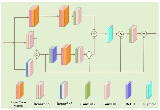 Here, and are the features extracted by Mamba and CNN, respectively. represents the Mamba module, denotes the parameters, represents layer normalization, and and represent the 5 × 5 and 3 × 3 separable convolutions, respectively, while ∗ denotes channel concatenation.