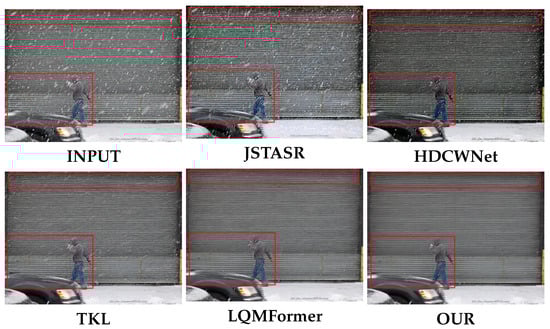 Images are an important way to record information, but their quality is often affected by weather conditions, especially snowy weather. The snowflakes scattered across the image can obscure other information, not only impacting the visual quality of the image but also severely interfering with downstream computer vision tasks such as object detection and recognition [], image segmentation [], and video surveillance []. Therefore, research on image desnowing is of great significance. Figure 1 shows the desnowing results of our method compared to other advanced methods on real images. It can be seen that our method achieves better desnowing performance.