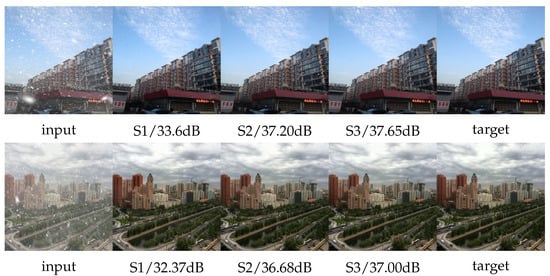 Implementation Details. The snow removal network designed in this paper adopts a four-level encoder–decoder progressive learning structure, which extracts snow image features at different scales through downsampling and upsampling. Different SCM blocks are set for feature learning according to the scale of the image at each level. The number of SCM blocks from the first to the fourth level is [2, 2, 9, 2], and the number of channels from the first to the fourth layer of the encoder–decoder is [48, 96, 192, 384]. The initial input image patch size is set to 128 × 128. As the input image patches increase in size, more image information is fed into the network, and the number of iterations for progressive learning is reduced. The correspondence between the two is shown in Table 1. During training, the model is implemented using the Pytorch framework on a single Nvidia RTX 3090, with the AdamW optimizer for updates and L1 Loss guiding the model in learning the snow removal process. The initial learning rate is set to , which decreases to 0.7 times its original value as the input patches change, and is reduced to through cosine annealing.