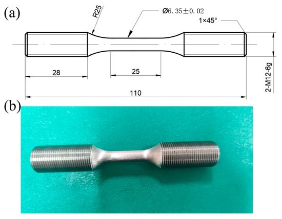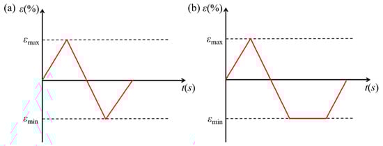 The experiments were conducted following Chinese standard GB/T 15248-2008 [21], “The Test Method for Axial Constant-Amplitude Low-Cycle Fatigue of Metallic Materials,” using an MTS fatigue testing machine [22]. In the tests, the strain amplitudes ranged from 0.2% to 0.8% and were applied at room temperature (23 °C), 400 °C, 600 °C, and 700 °C. Strain control was applied using a triangular waveform, as shown in Figure 1a, with a strain ratio of −1. The dimensions and physical appearance of the test specimens are illustrated in Figure 2.