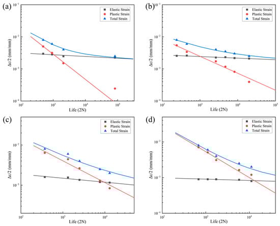 The strain–life relationships of the ductile iron material at various temperatures: (a) RT, (b) 400 °C, (c) 600 °C, and (d) 700 °C.
