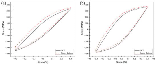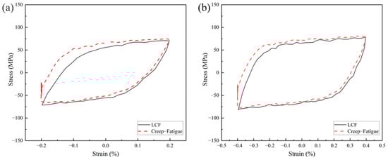 Comparison of creep–fatigue and LCF hysteresis loops at 400 °C under different strain amplitudes. (a) Strain amplitude of 0.3% and (b) strain amplitude of 0.4%.