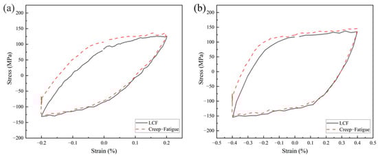 Comparison of creep–fatigue and LCF hysteresis loops at 600 °C under different strain amplitudes. (a) Strain amplitude of 0.2% and (b) strain amplitude of 0.4%.