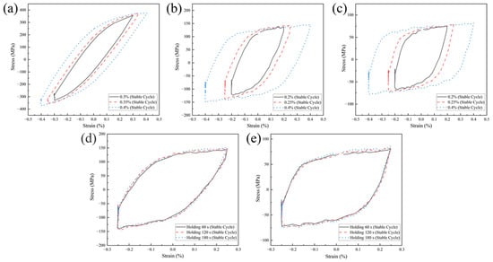 Stabilized hysteresis loops under various creep–fatigue conditions. (a) Stabilized hysteresis loops at 400 °C under various strain amplitudes, (b) stabilized hysteresis loops at 600 °C under various strain amplitudes, (c) stabilized hysteresis loops at 700 °C under various strain amplitudes, (d) stabilized hysteresis loops at 600 °C with various hold times, and (e) stabilized hysteresis loops at 700 °C with various hold times.
