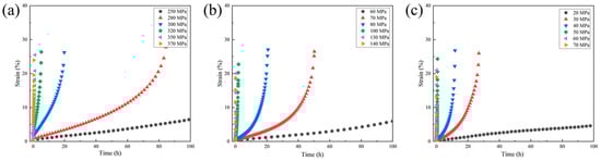 Creep curves of medium-silicon molybdenum ductile iron at various temperatures: (a) 400 °C, (b) 600 °C, and (c) 700 °C.